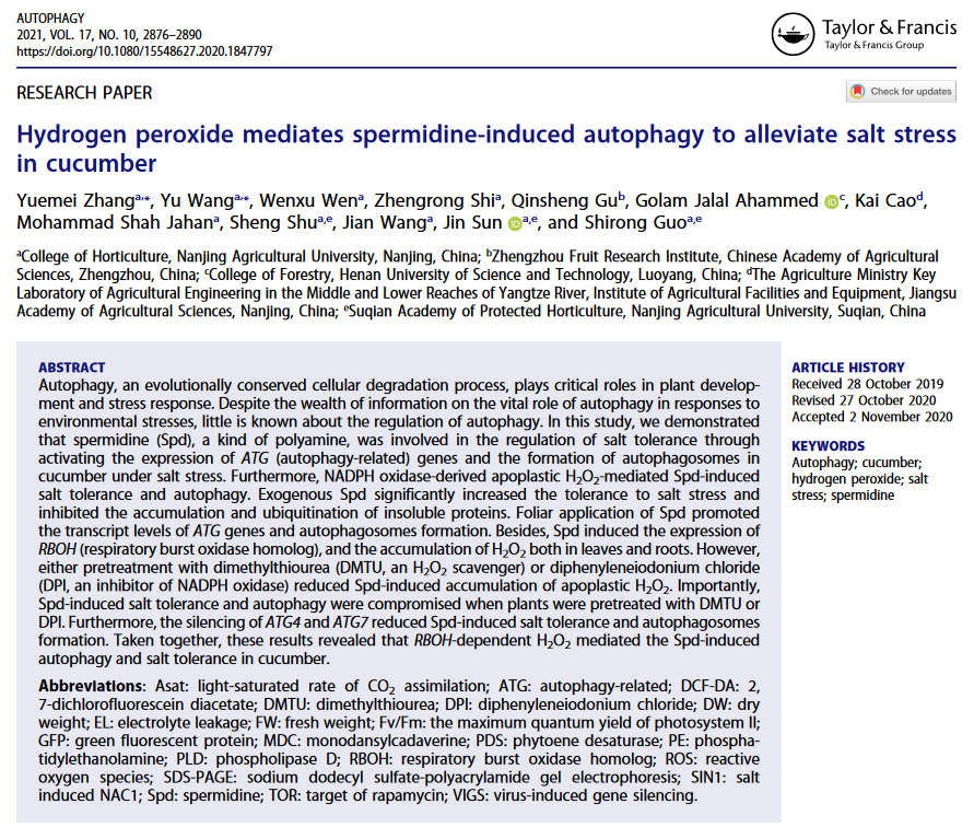 过氧化氢介导亚精胺诱导的自噬以缓解黄瓜的盐胁迫