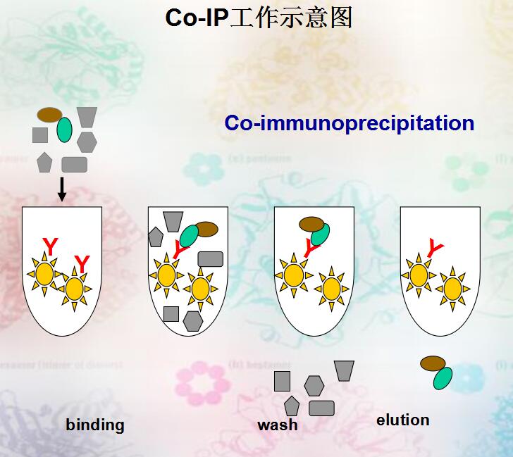 免疫共沉淀(co-immunoprecipitation,Co-IP)技术是检测蛋白质间相互作用 的经典方法, 其基本原理是以细胞内源性靶蛋白为诱饵,将靶蛋白抗体与细胞总蛋白进行共孵育,促进免疫复合物的形成;随后加入能够与抗体Fc段结合的prorein A/G(预先结合固化在琼脂糖小珠上),形成“结合蛋白-靶蛋白-靶蛋白抗体-proteinA/G小珠”复合物,纯化该复合物后凝胶电泳分离蛋白,应用 Western blot 或者质谱技术鉴定靶蛋白的结合蛋白。