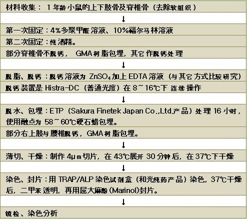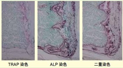 了解活体的骨代谢状态是研究相关细胞生理活性的一个有效方法。对骨组织进行碱性磷酸酶(ALP)染色后可以了解成骨细胞的骨形成情况,对骨组织进行抗酒石酸酸性磷酸酶(TRAP)染色可以了解破骨细胞的骨吸收情况。若在同一切片上进行双重染色就能同时了解两者的情况。另外,它有一个优点是在脱钙标本里,只要可以双重染色,无需专用的设备,仅用一般的设备就可以方便地观察到骨代谢。在此前提下,我们需要研究探讨双重染色的可行性。