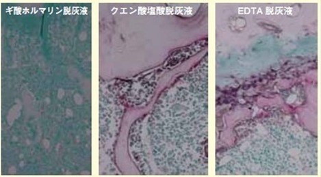 最左图是选用酸性脱钙溶液中对组织伤害较少的甲酸福尔马林