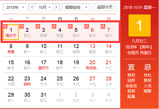 根据国家法定假期的规定,并结合公司实际情况,现对中秋节与国庆节放假做如下安排:国庆节放假时间:10月1日(星期一)至10月7日(星期天)放假共7天。其中9月29日(星期六)9月30日(星期天)上班调休,10月8号(星期一)正常上班。如有需要请客户及早下单备货以免耽误您的宝贵时间。