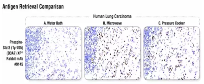 合适的修复液:根据抗体说明书使用合适的修复液。用柠檬酸修复后,切片需浸泡在修复液中,自然冷却;而用 EDTA 修复后,切片可直接从修复缸中取出,直接进行下一步。
