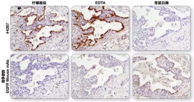 注:使用不同的修复方式和不同生产商的抗体检测人肺癌组织中 EGFR 的表达。第一排为 CST 的 EGF Receptor (D38B1) XP® Rabbit mAb(#4267),EDTA 的修复方式明显优于柠檬酸盐及胃蛋白酶,故在该抗体说明书中,标注了使用 EDTA 修复进行免疫组化实验。