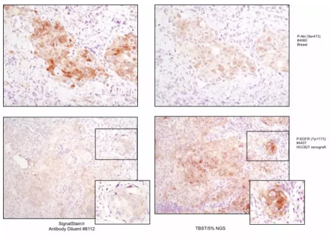 注:与#4060 在 TBST/5% NGS 中稀释后所得的信号强度相比,经 SignalStain® 抗体稀释液稀释后的信号强度更强;而对于#4407,选择 TBST/5% NGS 作为抗体稀释液的效果更好。