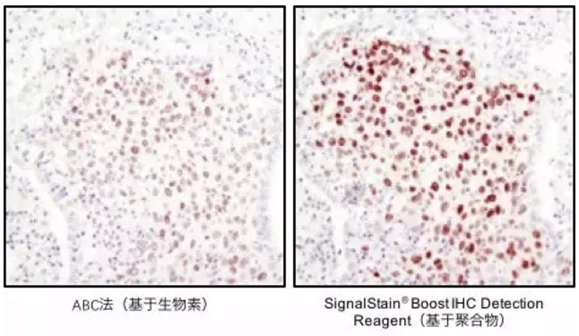 使用多聚 HRP(Poly-HRP)的二抗,即在二抗上连接大量 HRP,以充分放大信号;同时,配合优质的色原产品,提升灵敏度,增强信号。
