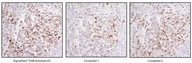 注:DAB 色原比较:在人乳腺癌组织中使用 p-Stat3(Tyr705)(D3A7)XP® Rabbit mAb#9145 检测 p-Stat3 的表达,使用不同的产品进行显色。与竞争者的 DAB 产生的信号相比,SignalStain® DABSubstrateKit 的显色强度更佳。