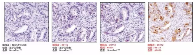 注:使用 PLK1(208 G4)Rabbit mAb #4513 检测人结肠肿瘤中 PLK1 的表达,在经过辅助试剂的步步优化后发现,使用一抗稀释液#8112 稀释抗体,聚合物型二抗#8114 进行检测,DAB 显色试剂#8059 后,可以检出 PLK1 的阳性表达。