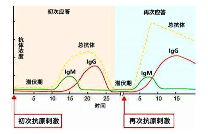 IgM 是人体接触外来抗原时最早产生的抗体,一般在感染 3~7 天内由 B 淋巴细胞直接产生,产生 IgM 的 B 淋巴细胞随后转移至淋巴结,在发生中心接受 T 细胞和抗原提呈细胞的刺激,进一步成熟,分化为浆细胞,大量产生 IgG。
