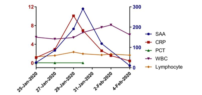 同时有研究表明,新冠病毒核酸阳性患者早期 SAA 明显上升,积极治疗后核酸复检阴性,SAA 显著下降并恢复正常。期间,PCT 和 WBC 结果一直正常与指南一致,CRP 虽有变化,但变化不明显。