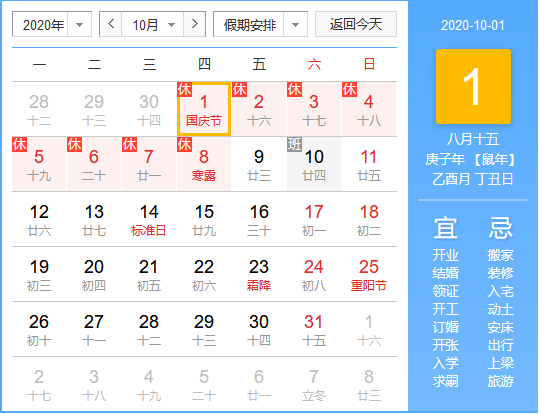 根据国家法定假期的规定,并结合公司实际情况,现对国庆节放假做如下安排:2020年国庆节和中秋节是同一天。十一国庆放假共8天,从10月1日至10月8日放假调休,10月9日正式上班,其中在9月27日(星期日)、10月10日(星期六)都需上班。如有需要请客户及早下单备货以免耽误您的宝贵时间。