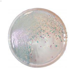 增菌后,方案A是采用mCCD琼脂和另一款其选择剂不同于mCCD的弯曲菌选择分离培养基来分离,方案B是采用mCCD琼脂来分离。均为微需氧41.5℃培养44h±4h。在mCCD琼脂上弯曲菌典型菌落为灰色。对于ISO10272-1:2017中方案A所提到的另一款其选择剂不同于mCCD的弯曲菌选择分离培养基,可选择HiCrome弯曲菌显色培养基(厂家:HiMedia,货号M2020,配合弯曲菌选择性添加剂(货号FD178)一起使用)。该显色培养基含有复合蛋白胨、氯化钠、多种显色剂、生长因子和琼脂。适用于食品样本和临床样本。培养基配好为在平皿中为黄色透明至轻微不透明凝胶。35-37℃孵育24-48小时后,弯曲菌菌落为淡紫色(下图),回收率≥50%。而金葡菌和大肠埃希菌均被抑制。