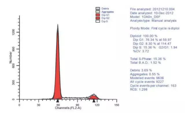 2、细胞消化要理想,资料显示最好消化时加EDTA,充分使细胞消化成单个细胞,因为细胞成团会被流式细胞仪误检测成多倍体,从而使结果中G2/M期细胞比例增加。