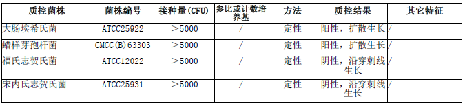 按标签用法制备培养基,接种以下质控菌株,放置36±1℃需氧培养24-48小时。