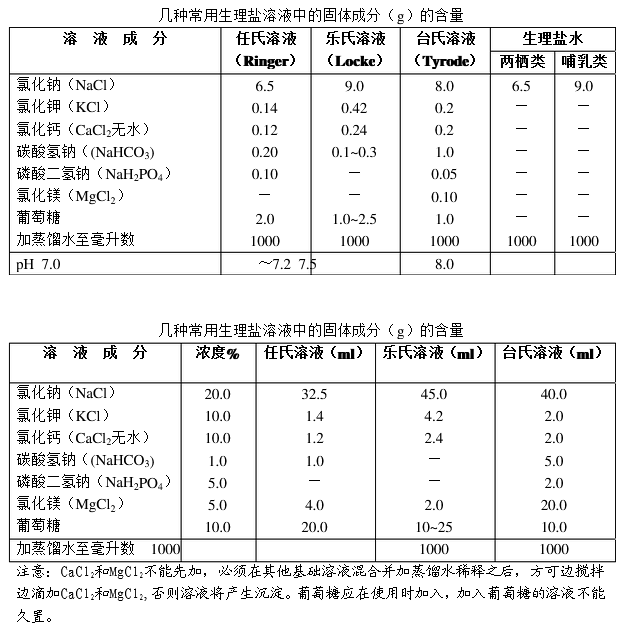 动物实验中常用的生理盐溶液有生理盐水、任氏(Ringer)溶液、乐氏(Locke)溶液和台氏(Tyrode)溶液四种,其成分各异,如下表所示。