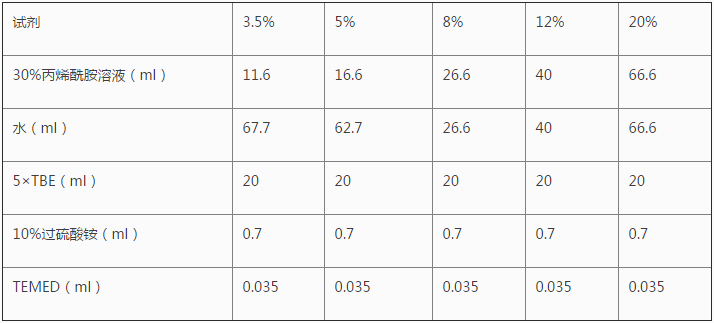 制备适量合适浓度的凝胶,使之略多于胶板。制备100μl体积凝胶的配制方法见下表。