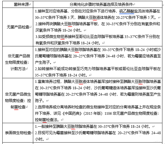 微生物鉴定的第一步是待检培养物的分离纯化,最常用的分离纯化方法是挑去待检菌的纯培养物(单个菌落),必要时可进一步进行纯培养,为表型鉴定和随后的鉴定程序提供足够量的菌体。从药物原材料、制药用水、生产环境、中间产品和最终产品的样品中检出的受损微生物,经分离纯化程序使其由不利生存易产生变化的状态变为在营养富集和最佳培养温度条件下生存的稳定状态,以保证鉴定结果的准确性,具体详见表1。
