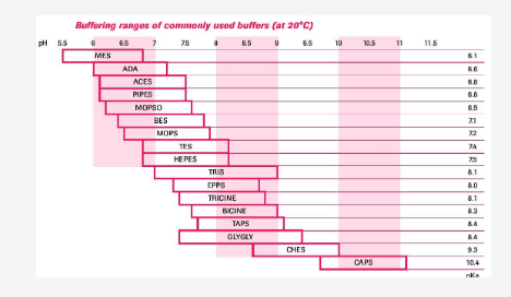 这些常用的缓冲液包括:MES、ADA、ACES、PIPES、MOPSO、BES、MOPS、TES、HEPES、TRIS、EPPS、TRICINE、BICINE、TAPS、GLYGLY、CHES、CAPS。