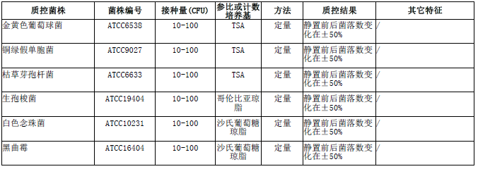 按标签用法制备培养基,接种以下质控菌株,放置20-25℃需氧培养45分钟。