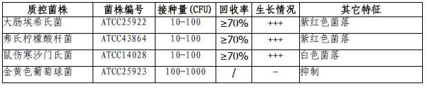 按标签用法制备培养基,接种以下质控菌株,放置36±1℃需氧培养18-24小时。