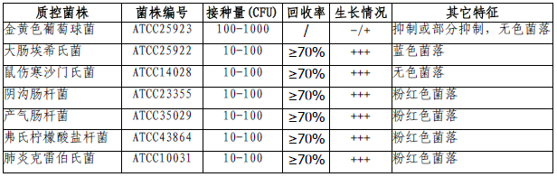 按标签用法制备培养基,接种以下质控菌株,放置36±1℃需氧培养18-24小时。