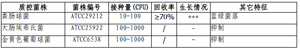按标签用法制备培养基,接种以下质控菌株,放置36±1℃需氧培养24-48小时。