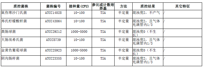 按标签用法制备培养基,接种以下质控菌株,放置36±1℃需氧培养24-48小时。