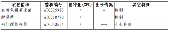 按标签用法制备培养基,接种以下质控菌株,放置36±1℃微需氧培养72-96小时。